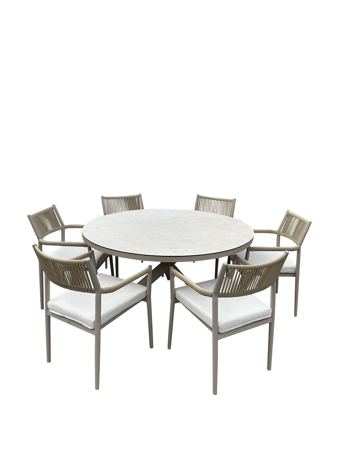 שישה כיסאות מרופדים עם גב קלוע ברצועות חבלים איכותיות מספקים נוחות יוצאת דופן לצד עמידות גבוהה לתנאי חוץ.