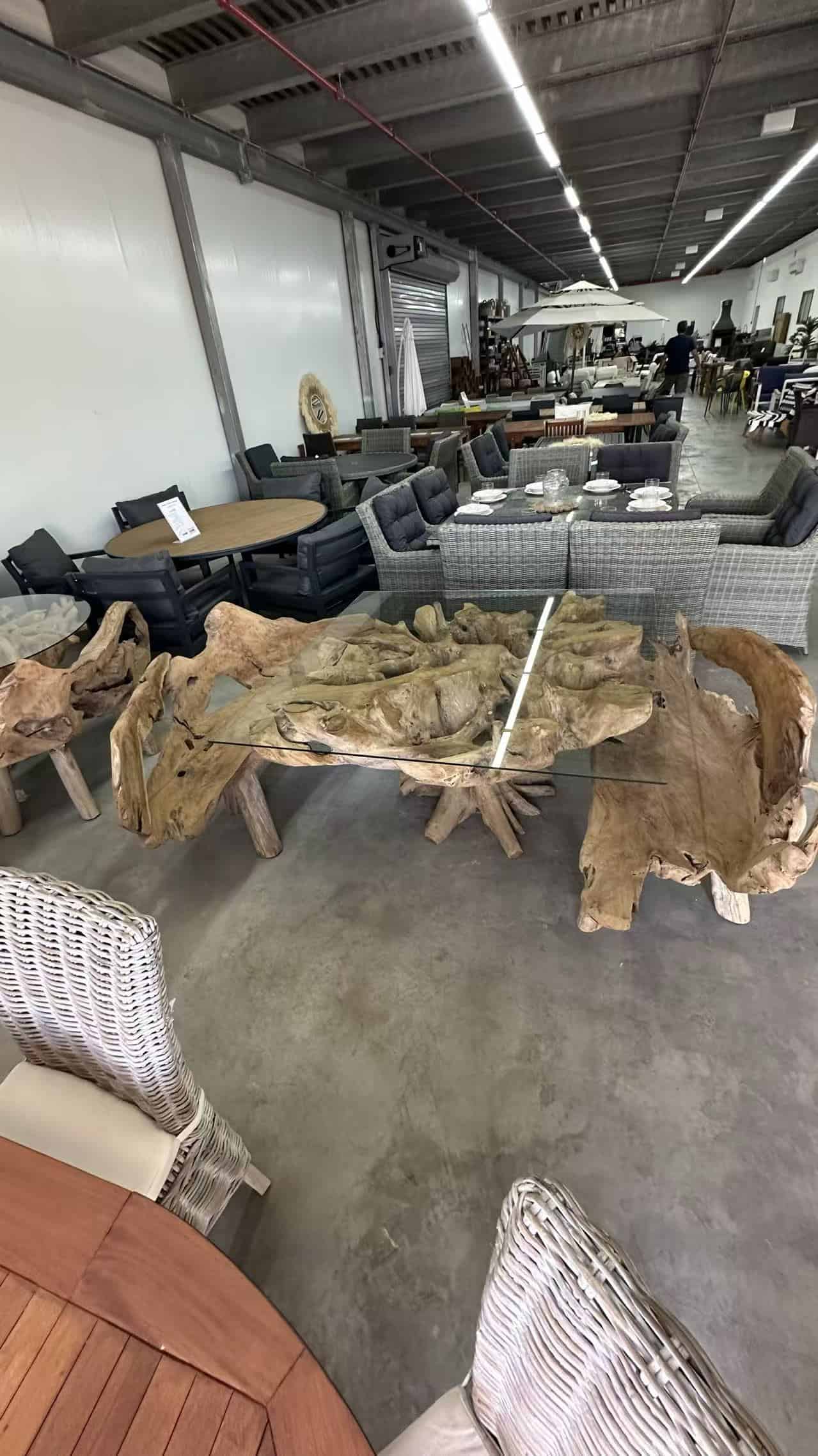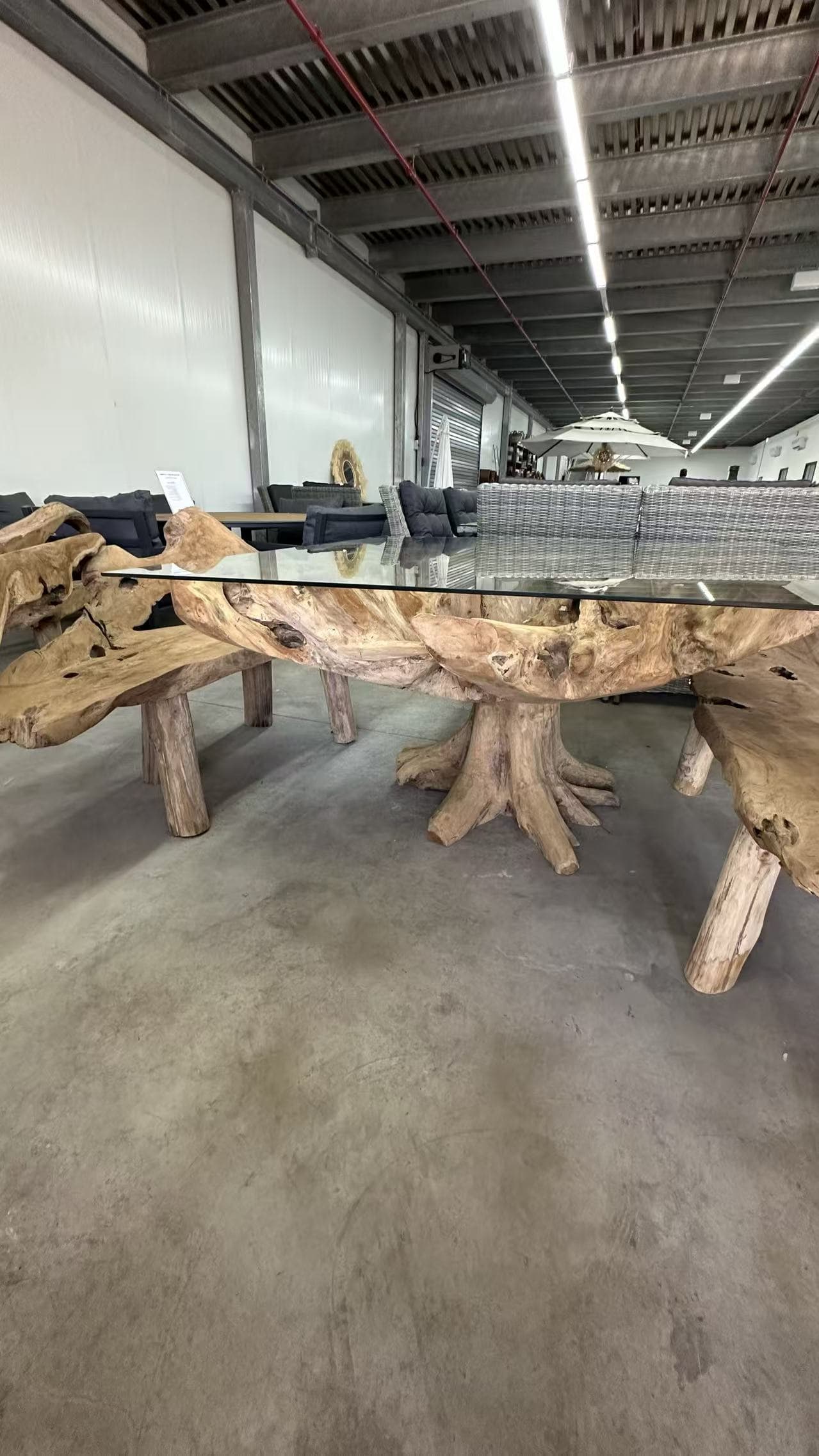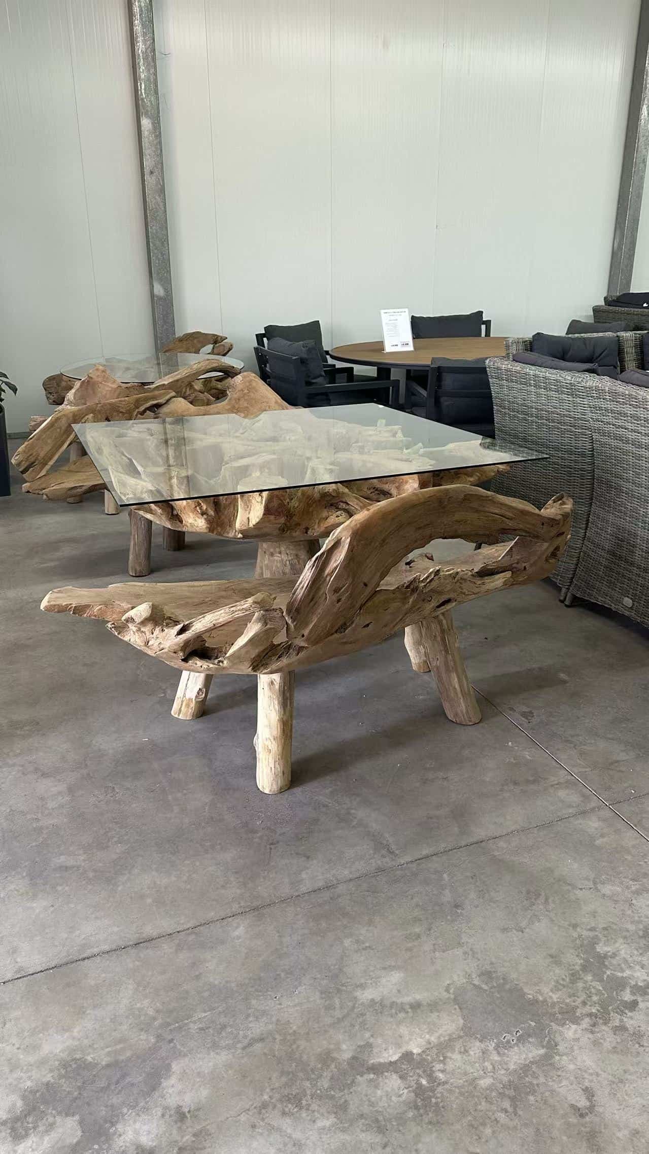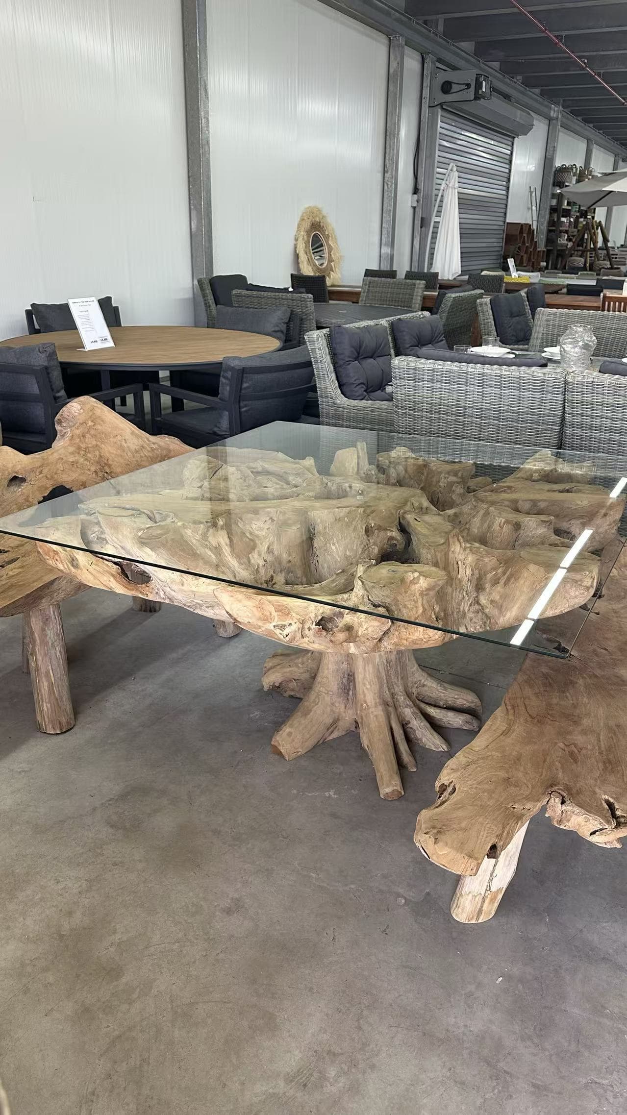 החלק העליון של השולחן מורכב מזכוכית מחוסמת עבה ושקופה, המונחת על מבנה עץ מלא בעל מראה שורשים טבעי וייחודי.